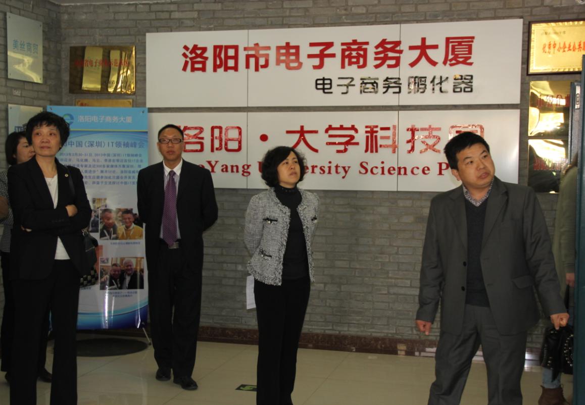 2013年4月12日上午,由洛陽市副市長楊萍率領的信息產業園觀摩團到洛陽·大學科技園起步區——青島路孵化基地參觀考察。