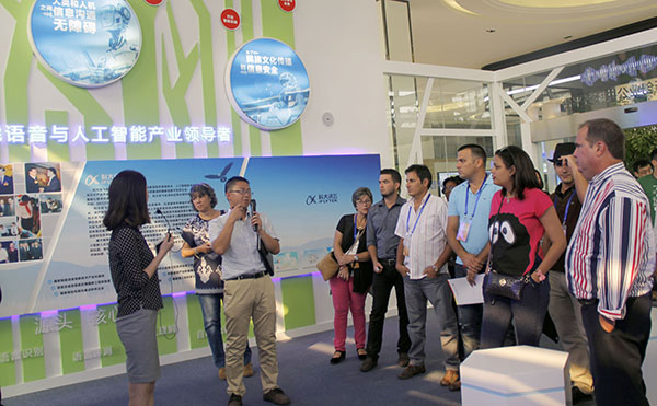 在園區(qū)一樓招商中心沙盤區(qū),工作人員向訪華團(tuán)一行介紹了園區(qū)的基本規(guī)劃、運(yùn)營(yíng)機(jī)制、公共服務(wù)平臺(tái)建設(shè)、入園企業(yè)運(yùn)行情況。隨后,訪華團(tuán)一行到園區(qū)展示中心、中科院、科大訊飛、視微影像和視辰科技展示區(qū)、企業(yè)成果展示區(qū)、機(jī)器人體驗(yàn)中心和園區(qū)眾創(chuàng)空間等區(qū)域參觀考察,對(duì)參觀各處的高科技產(chǎn)品表示了濃厚的興趣。