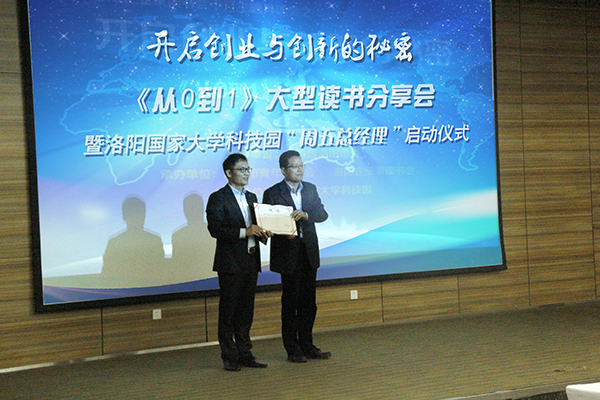 10月23日,《從0到1》大型讀書(shū)分享會(huì)暨洛陽(yáng)國(guó)家大學(xué)科技園“周五總經(jīng)理”啟動(dòng)儀式,在洛陽(yáng)國(guó)家大學(xué)科技園舉行,河南視辰信息科技有限公司總經(jīng)理韓云峰成為第一任“周五總經(jīng)理”,現(xiàn)場(chǎng)接受上崗證書(shū)。