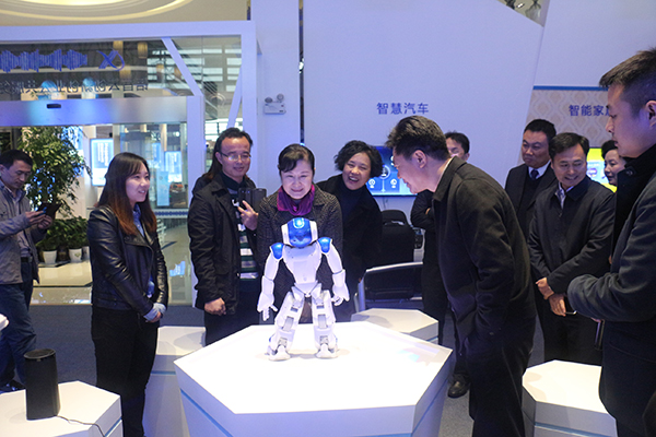 在科大訊飛“語音云創新創業公共服務平臺服務平臺”現場,董錦燕一行先后參觀體驗了科大訊飛研發的多語種智能口語測評系統、暢言系列教育產品、智能語音玩具、智能語音家居、智慧汽車等系列產品,個性化的語音識別、秒變文字的智能輸入、隨叫隨到的語音喚醒、人機交互的智慧課堂、一站式控制的智能家居、能聽會說的叮咚音響等高科技演示,獲得了考察團一行的不斷稱贊。隨后,董錦燕一行到企業成果展示區、智能裝備及工業機器人體驗中心等區域進行考察。