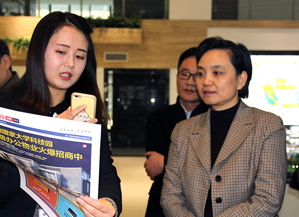 在張衡園1#樓展示中心,洛陽國(guó)家大學(xué)科技園負(fù)責(zé)人向陳淑欣一行詳細(xì)匯報(bào)了園區(qū)規(guī)劃、產(chǎn)業(yè)定位、運(yùn)營(yíng)機(jī)制、公共服務(wù)平臺(tái)、入園企業(yè)構(gòu)成等情況。