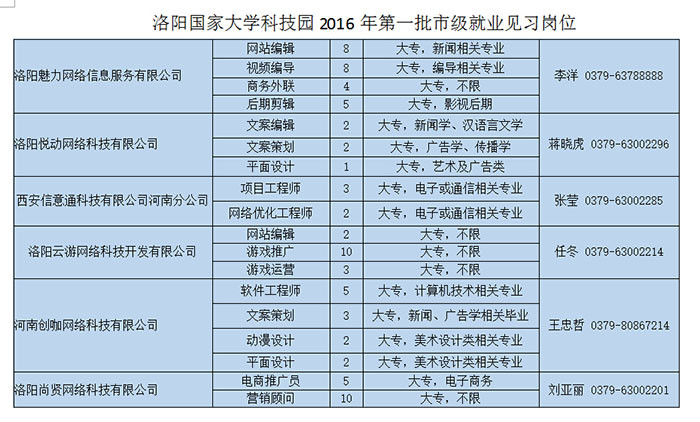 1月1日,洛陽市人社局公布今年首批就業見習崗位,26家用人單位提供1117個見習崗位,其中,洛陽魅力網絡信息服務有限公司、洛陽悅動網絡科技有限公司、西安信意通科技有限公司河南分公司、洛陽云游網絡科技開發有限公司、河南創咖網絡科技有限公司、洛陽尚賢網絡科技有限公司6家洛陽國家大學科技園園區企業提供18個崗位,現在接受社會報名。