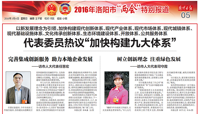 3月6日,《洛陽日報》第5版2016全國“兩會”特別報道刊發文章《代表委員熱議“加快構建九大體系”》 ,報道了洛陽市9名人大代表和政協委員熱議,以新發展理念為引領,加快構建現代創新體系、現代產業體系、現代市場體系、現代城鎮體系、現代基礎設施體系、文化傳承創新體系、生態環境建設體系、開放體系、公共服務體系。其中,洛陽市人大代表、洛陽國家大學科技園董事長任慧宏提出,完善集成創新服務,助力本地企業發展。